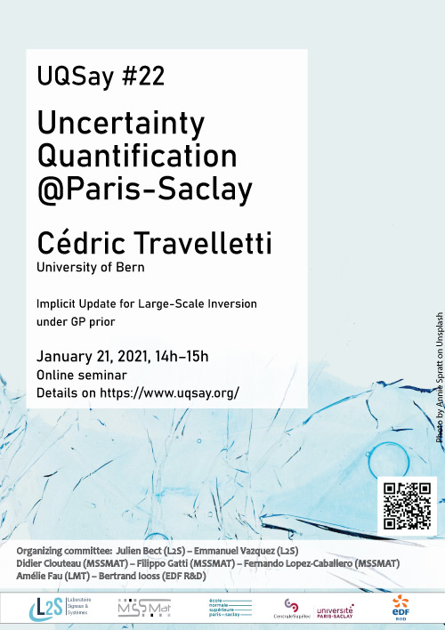 Degradation prognostics of industrial assets involves estimating their remaining useful life (RUL) by projecting current health indicators and operating conditions while quantifying associated uncertainties. These prognostics are central to the development and deployment of digital twins, which aim to provide insights into the evolving state of complex systems. Traditionally, RUL estimation relies on physics-based simulations or data-driven models. While both have their merits, they can prove inadequate when simulation runtimes are prohibitive or when degradation data is sparse, common challenges in digital twin implementations for critical industrial infrastructure. To address this problem, we developed an offline modular data assimilation approach. Firstly, a Bayesian model updating strategy combines kernel-based sensitivity analysis to identify and rank the time-varying influence of the model’s input variables, with a tailored inference scheme that accounts for the heterogeneity of available data. Posterior distributions are sampled using MCMC techniques, while the method mitigates the curse of dimensionality by iteratively updating the marginals of influential input variables under an independence assumption. Posterior informativeness is quantified through the Kullback–Leibler divergence, comparing updated distributions to their priors. Secondly, the full state distribution is updated with the help of an ensemble Kalman smoothing step, further reducing the posterior uncertainty. After detailing the methodology, I will illustrate how this approach enhances the fidelity of RUL predictions and reduces uncertainty in a clogging prognostics use case for digital twins of steam generators in nuclear power plants. References: Joint work with Emmanuel Remy (EDF R&D) & Vincent Chabridon (EDF R&D) & Mathilde Mougeot (ENS Paris-Saclay) & Didier Lucor (LISN).The technical side of things: you can use Teams either directly from your web browser or using the « fat client », which is available for most platforms (Windows, Linux, Mac, Android & iOS). We strongly recommend the latter option whenever possible. Please give it a try before the seminar to anticipate potential problems.